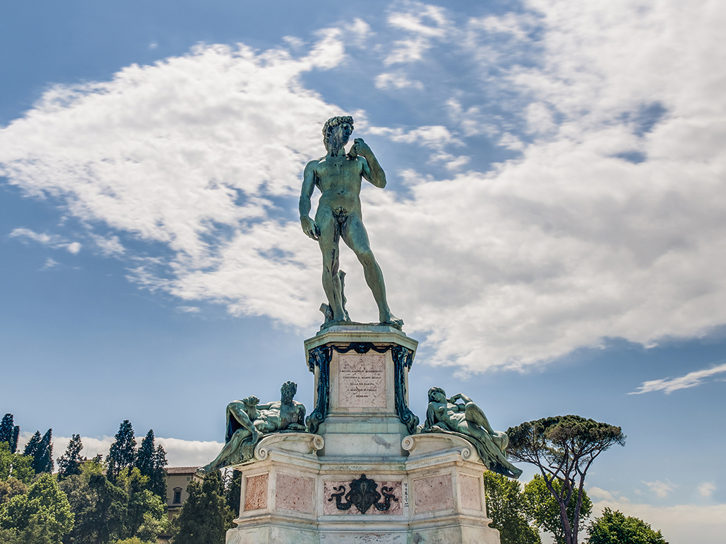 Если бы имитация была самой чистой формой лести, Микеланджело бы покраснел: статуя Давида была воспроизведена бесчисленным количеством способов, от рисунков в книгах на столах до маленьких копий всех форм и цветов до кухонных фартуков. Кроме этих безделушек, в мире существует 30 копий Давида в натуральную величину, самая известная из которых находится во Флоренции. Первая находится на площади Синьории перед Палаццо Веккьо, где изначально была установлена статуя Давида; вторая — на площади Микеланджело и отлита из бронзы.