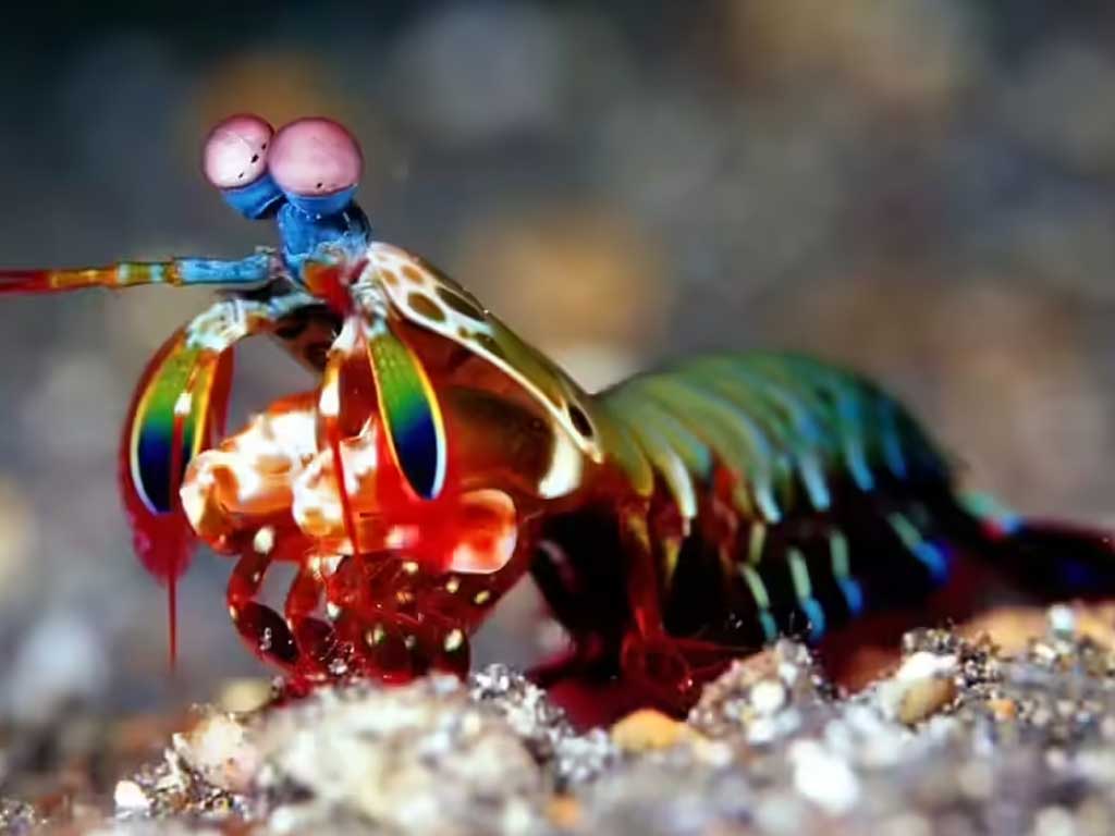 Креветка-богомол наносит удар передними конечностями с ускорением, сравнимым с пулей, создавая подводные ударные волны. Сила удара позволяет ей разбивать раковины моллюсков и оглушать добычу. Дополнительно этот вид обладает сложной зрительной системой, воспринимающей спектры света, недоступные человеку.