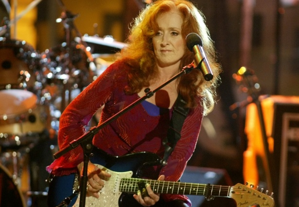 Бонни Рэйтт известна не только своим мастерством игры на слайд-гитаре, но и фирменной комбинацией рыжих волос с белой прядью.