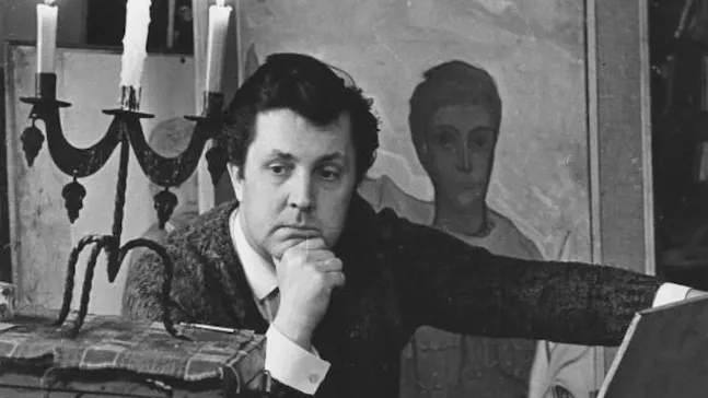 Сцена: группа известных культурных фигур в компании художников и музыкантов.