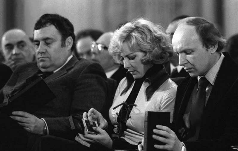 8. Рязанов, Брыльска и Мягков на вручении премии за фильм «Ирония судьбы…», 1976 год