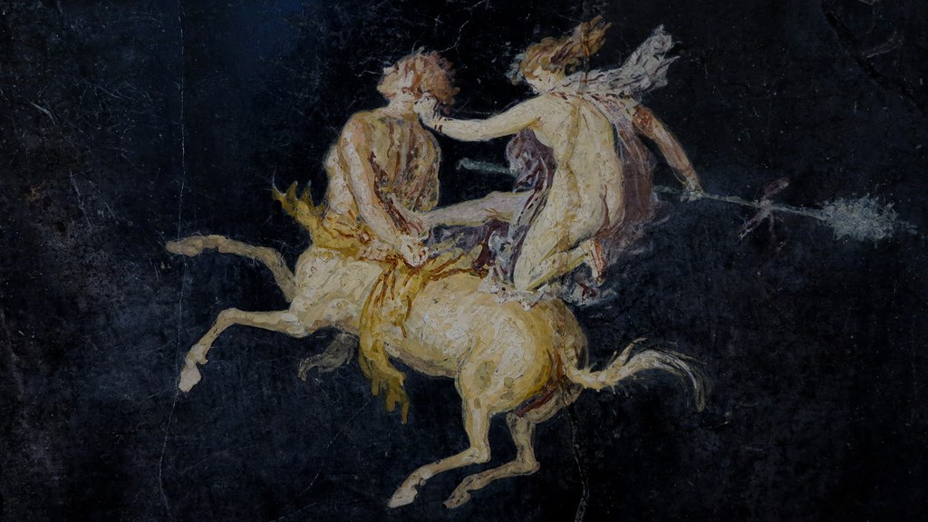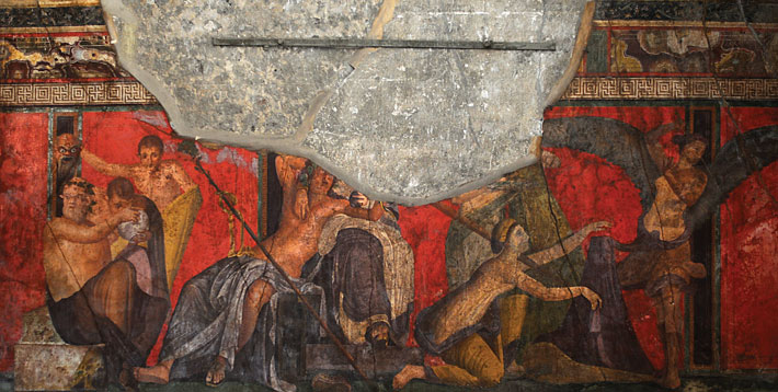 В недавно обнаруженном помещении на Виа ди Нола фрески с героями Троянской войны и дионисийскими процессиями разворачиваются в плотный сюжет, где мифология переплетается с реальными ритуальными сценами, а танцы вакханок источают движение и энергию, словно застывшую в краске.