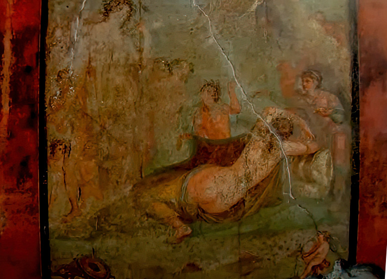 Новые фрески, недавно обнаруженные в банкетном зале Помпей, покрывают три стены сценами таинства Диониса (Баха), богом вина и экстаза. Танцующие вакханки, охотницы и процессии наполнены энергией, словно застывшие кадры древнего театра.