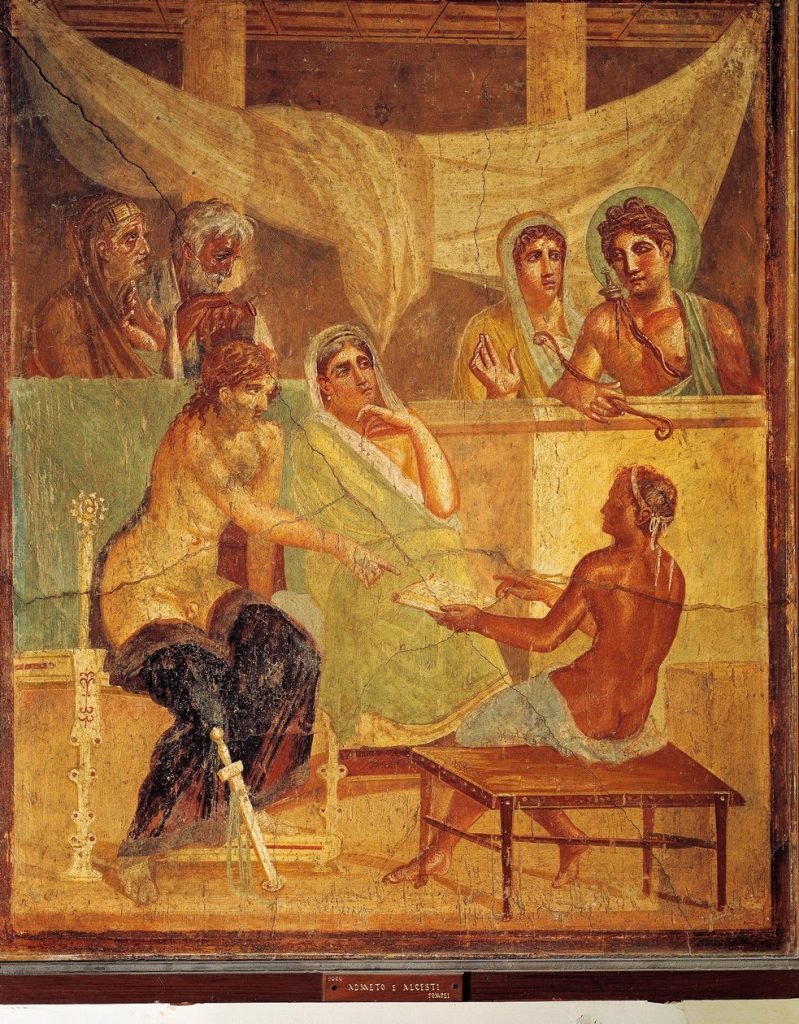 Мифологические сцены с Еленой Троянской, Адметом и Алкестой разворачиваются по стенам, словно мифологическая драма, отражающая страсти и трагедии, которыми жили древние хозяева дома. Эти фрески напоминают ожившие страницы эпоса, где чувства и судьбы запечатлены в цвете и линии.