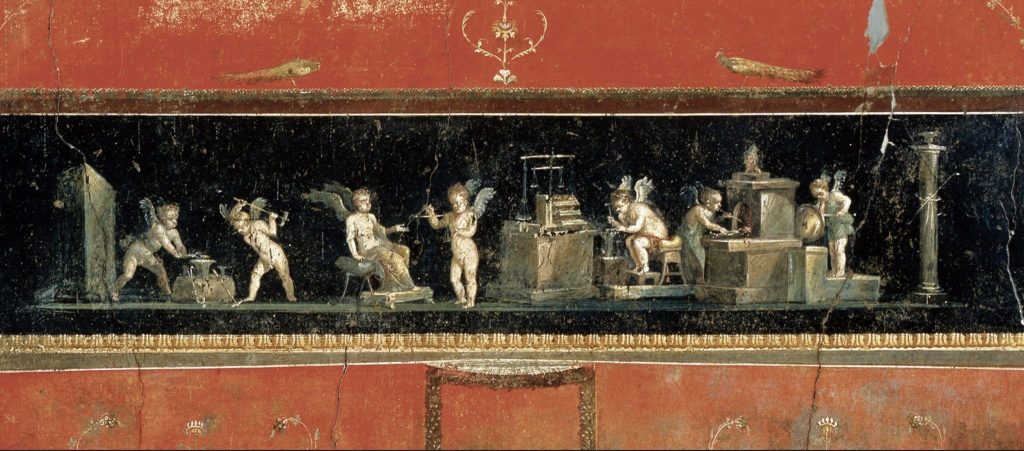 В этом доме удивительная серия живописных панно: сцены с купидонами, занимающимися всевозможными делами — от религиозных обрядов до продажи цветов и духов, а затем кульминацией становится процессия в честь Диониса (Баха), где козлы тянут коляску бога. Эти фрески в четвёртом стиле Помпейской живописи объединяют глубину мифологии с бытовыми мотивами и демонстрируют, почему римские стены выглядели как театральные сцены.