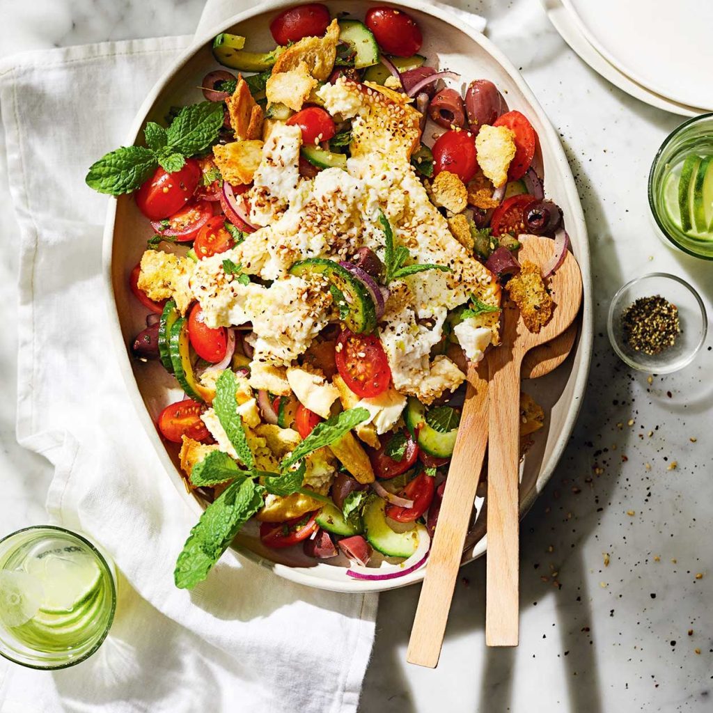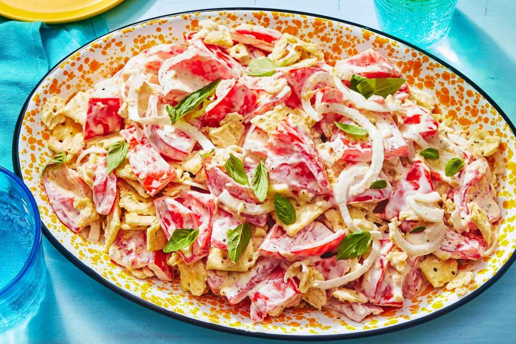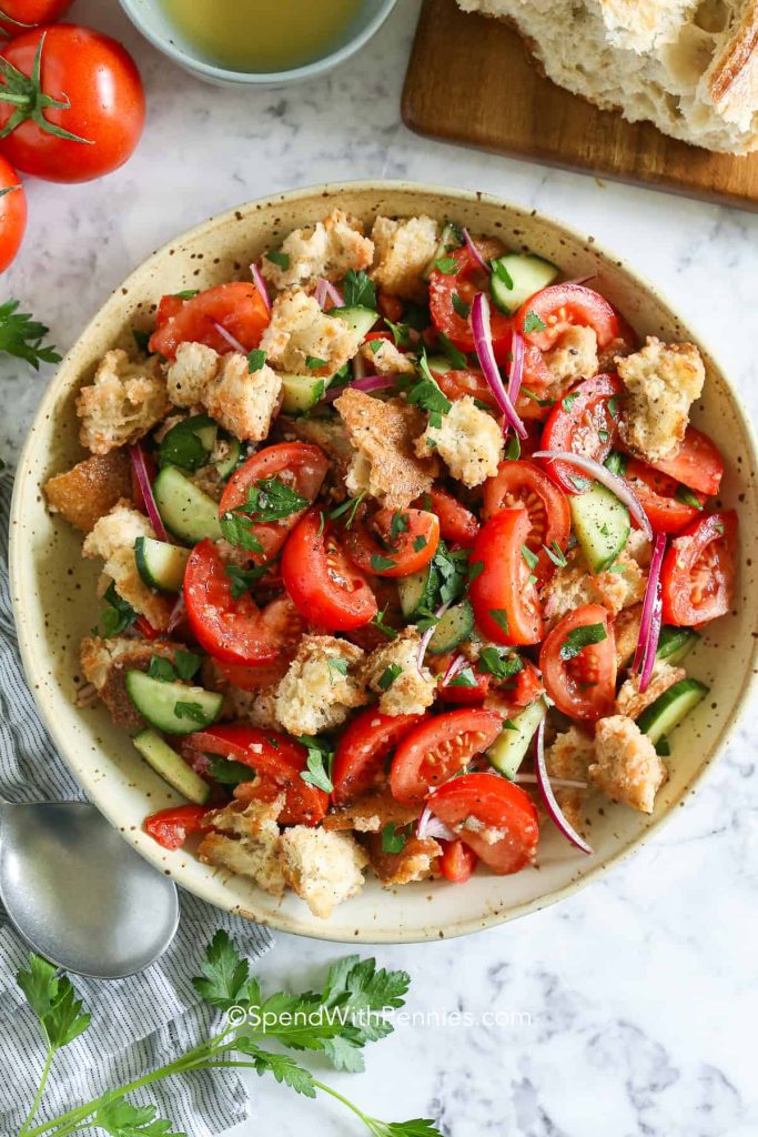 Этот салат демонстрирует использование остаточного хлеба и сезонных овощей.