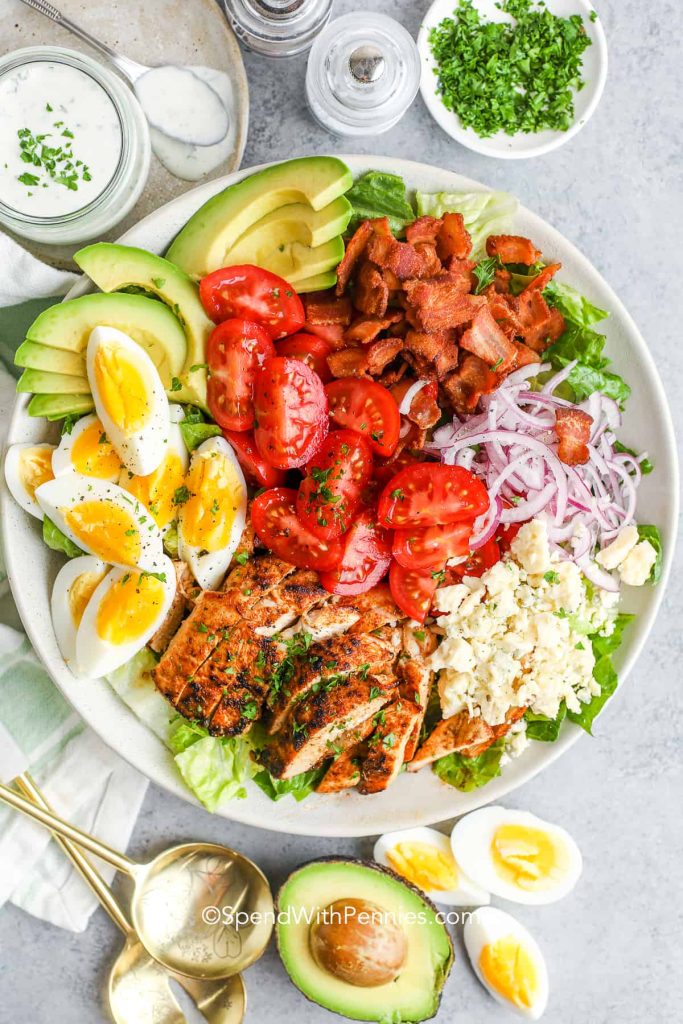 – Основные ингредиенты: салат, курица, авокадо, помидоры, яйца, бекон, сыр