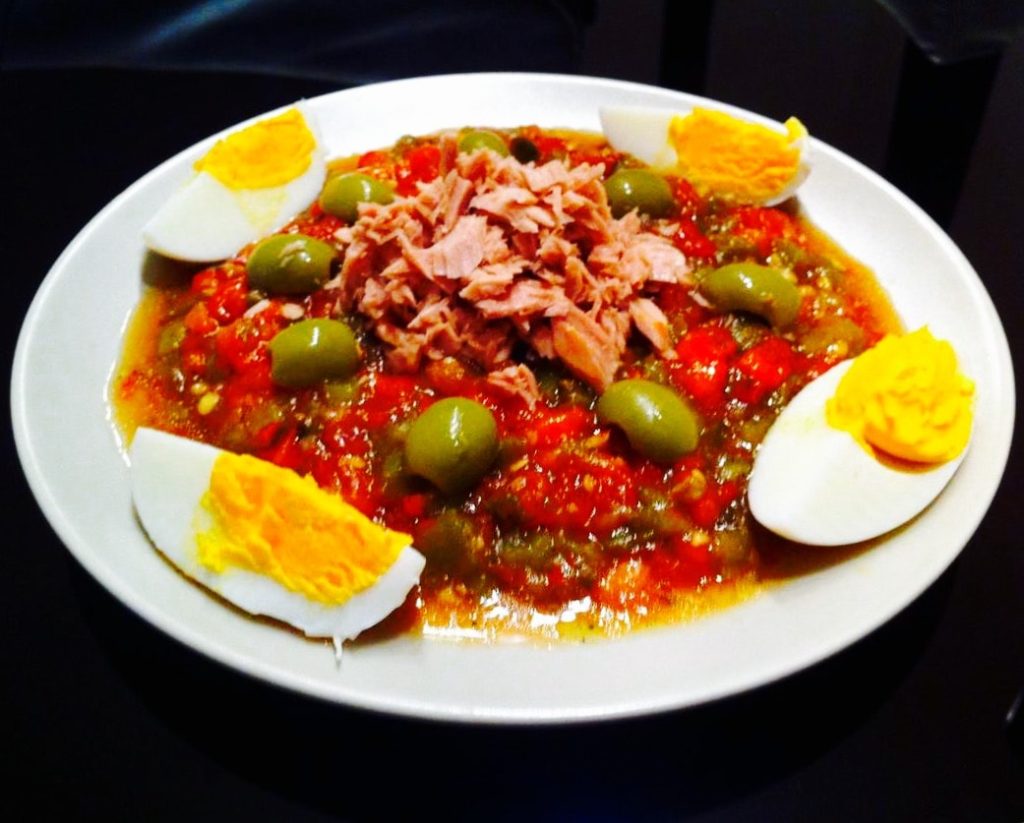 – Основные ингредиенты: помидоры, яйца, оливки, тунец или анчоусы
