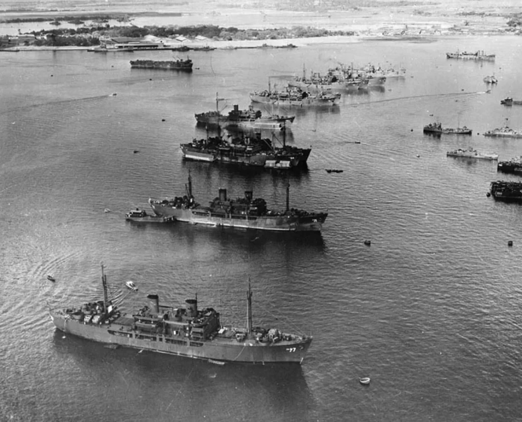 Флот поддержки из 150 других кораблей отступил на позицию в 10 морских милях от атолла и стал ждать.