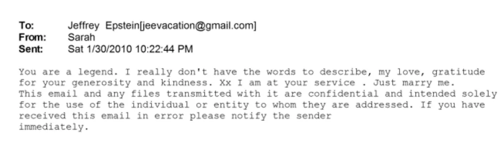 Письмо с фразой «Просто женись на мне» (англ. «Just marry me») появилось в сети после публикации архивов Эпштейна. Скриншот этого сообщения стал вирусным и вызвал бурное обсуждение. Оно приписывается Саре Фергюсон и адресовано Джеффри Эпштейну. Подлинность письма остаётся предметом споров среди экспертов и журналистов. Этот документ добавил скандалу личный и эмоциональный оттенок.