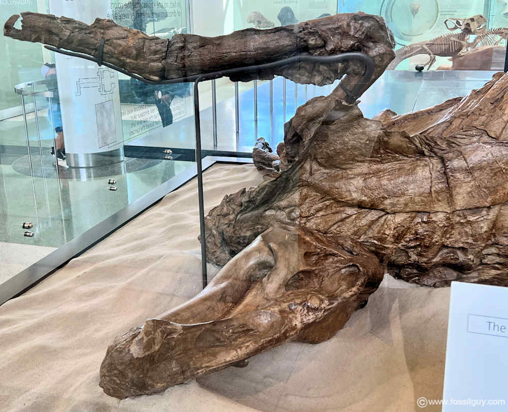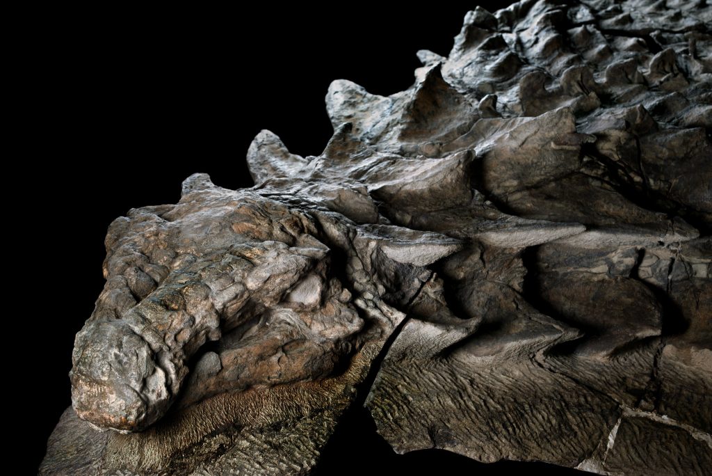 Тело этого анкилозавра, жившего около 110 млн лет назад, сохранилось с минимальными повреждениями: можно видеть броневые пластины, расположение шипов и даже остатки кератиновых покровов на поверхности панциря.